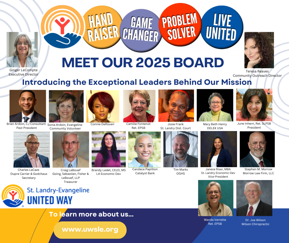St. Landry-Evangeline United Way is governed by a volunteer Board of Directors representing the communities we serve. The diversity of our volunteers is the key to our strength and effectiveness. We rely on their wisdom, their experience and their passion to advance the common good in St. Landry and Evangeline parishes.